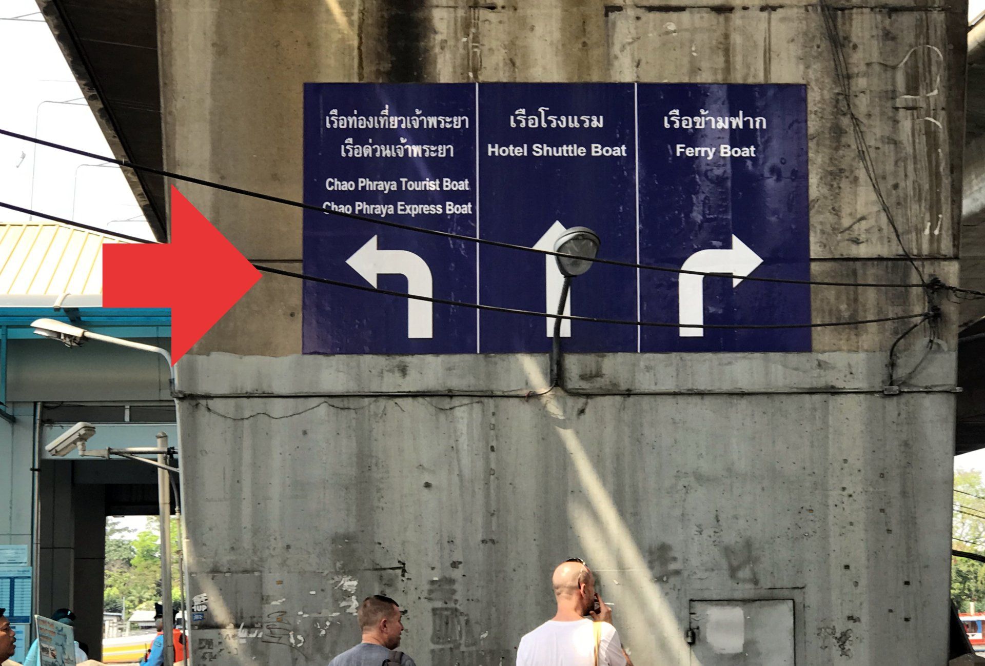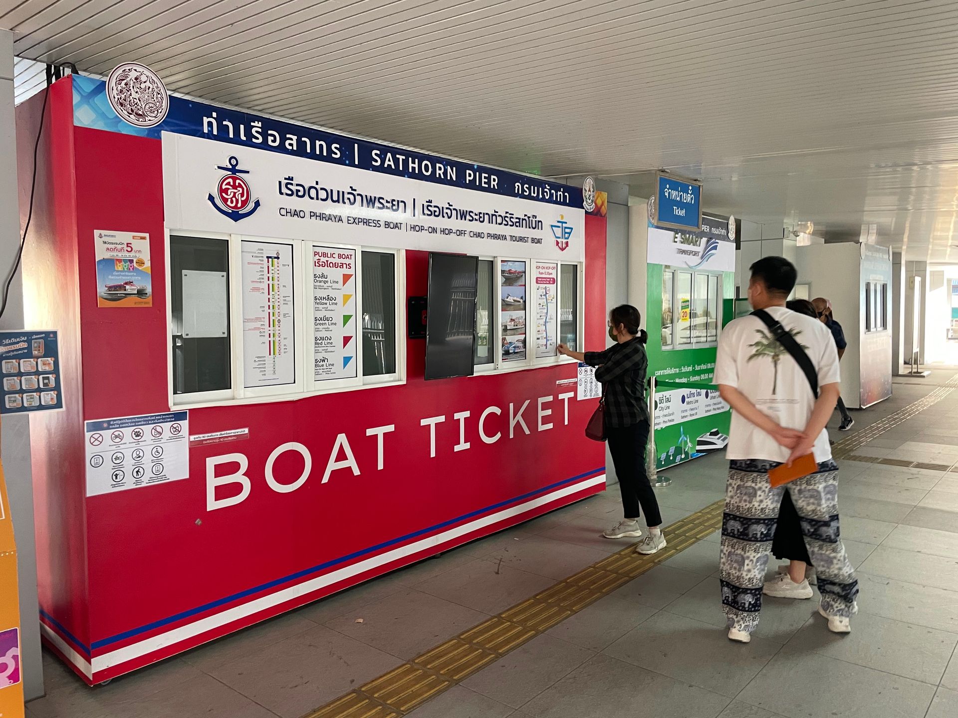 Wenn Sie die Treppe hinunter gegangen sind, kommen Sie an den Pier. Freundliche Menschen versuchen sie zur Nutzung des Touristen Bootes zu drängen. STOP! Da wird es teuer;) Im roten Ticket Container werden LINKS die Fahrten mit dem perseiwerten Chao Praya Express Boot angeboten!