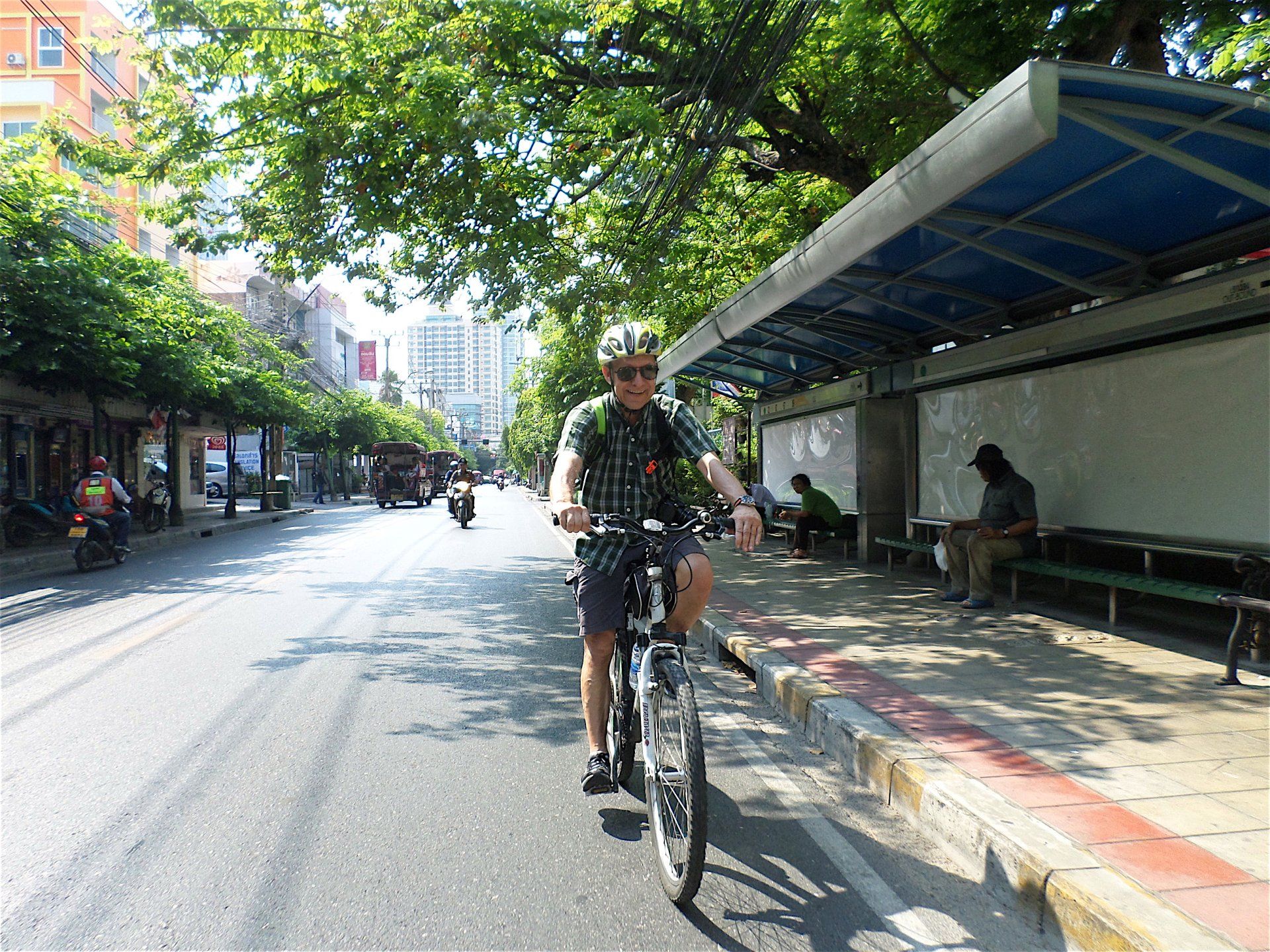 Radfahren macht Spaß! Auch in Bangkok:) Aber man sollte nicht übermütig werden. Wie Sie auf dem Bild sehen, gibt es auf Hauptverkehrsstraßen wie hier auf der Sathon Rd. zwar Fahrradstreifen. Aber irgendwie kümmert es niemanden. Für mich ist die Frage nicht ob sondern wo man in Bangkok sicher Radfahren kann. Wenn Sie die Stadt kennen, können Sie durchaus ein Fahrrad ausleihen und z.B. in der Nähe des Chao Praya radeln oder nördlich der Sukhumvit (ca. 300 Bath/9€ pro Tag). Aber ich rate Ihnen für Ihren kurzen Aufenthalt in der Stadt besser eine geführte Radtour zu buchen. Sie sind nicht teuer, führen Sie auf interessante Wege und Sie fühlen sich sicherer!