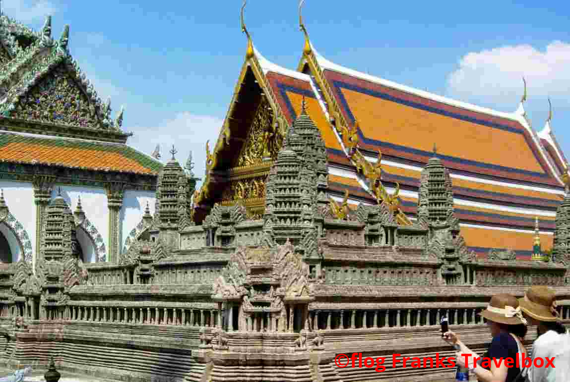 Neben dem Tempel des Smaragd Buddhas sind die diversen prachtvollen Residenzen und Thronsäle nur teilweise der Öffentlichkeit zugänglich. Eindrucksvoll ist aber auch ein originalgetreues Modell von Angkor Wat aus dem Jahr 1882 Kambodscha war damals Vasallenstaat von Siam). Spektakulär ist der zentrale Hof des Palastes, in dem schon König Rama I. gekrönt wurde.