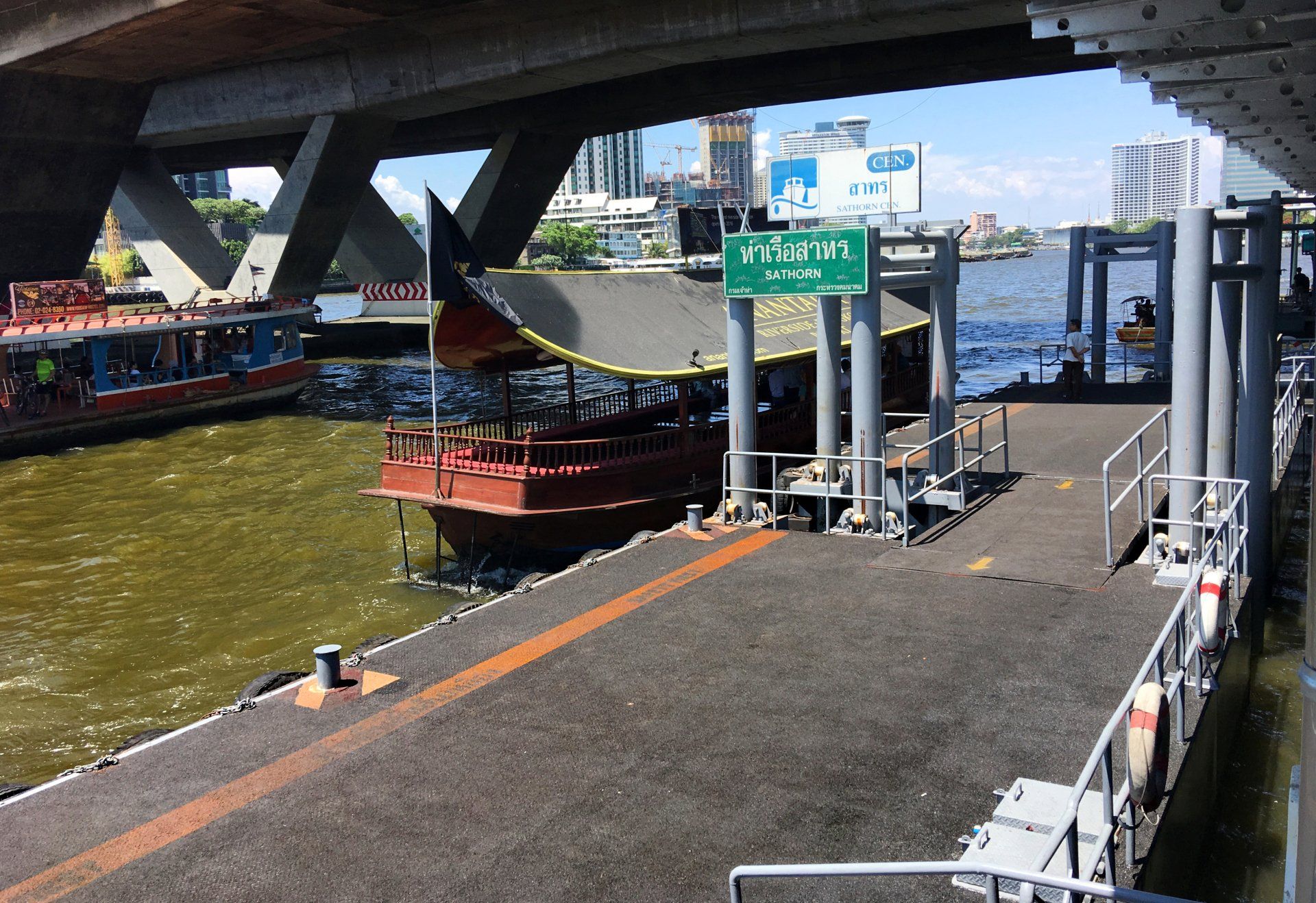 You can either arrive at "Saphan Taksin" station by Skytrain "Blue Line Silom" or you can get here by taxi. Importantly, Sathon Pier is on the left side of the Skytrain as you face the river!