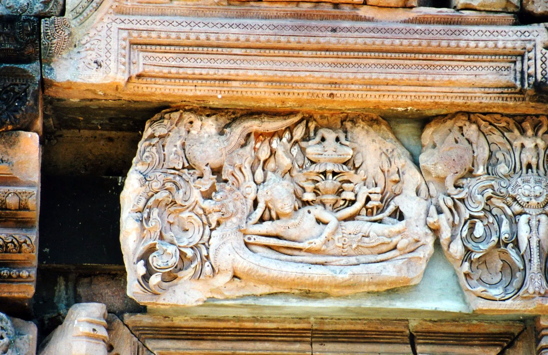 Dieses berühmte Relief über dem Ost-Eingang des Zentral-Tempels verschwand in den 1960er Jahren. Im Jahr 1968 tauchte es plötzlich im Art Institute of Chicago auf. Das Museum behauptete jahrelang, dieses eindrucksvolle, Gott Vishnu gewidmete Relief in gutem Glauben erhalten zu haben. Nach einer großen Kampagne gegen den Kunstdiebstahl gaben sie es 1988 an Thailand zurück. Die Ankunft in Bangkok wurde live im Fernsehen übertragen!